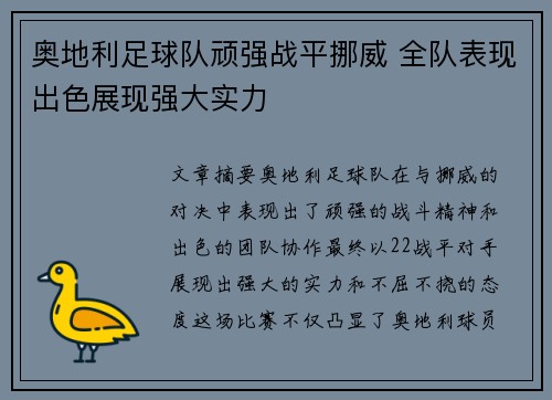 总体而言,奥地利足球队在与挪威的比赛中,凭借着出色的战术布置、默契的团队协作、关键球员的个人表现以及顽强拼搏的精神,展现了强大的实力和顽强的斗志。尽管比赛中双方都展现了不小的竞争压力,但奥地利队始终保持冷静,并最终与对手战平,证明了他们的实力和精神。这场比赛不仅仅是一次战术和技术的较量,更是奥地利队团队精神和不屈意志的体现。